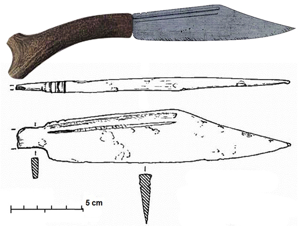 | Hoja de un scramasax de origen vikingo. En la parte superior podemos ver una reconstrucción del mismo |