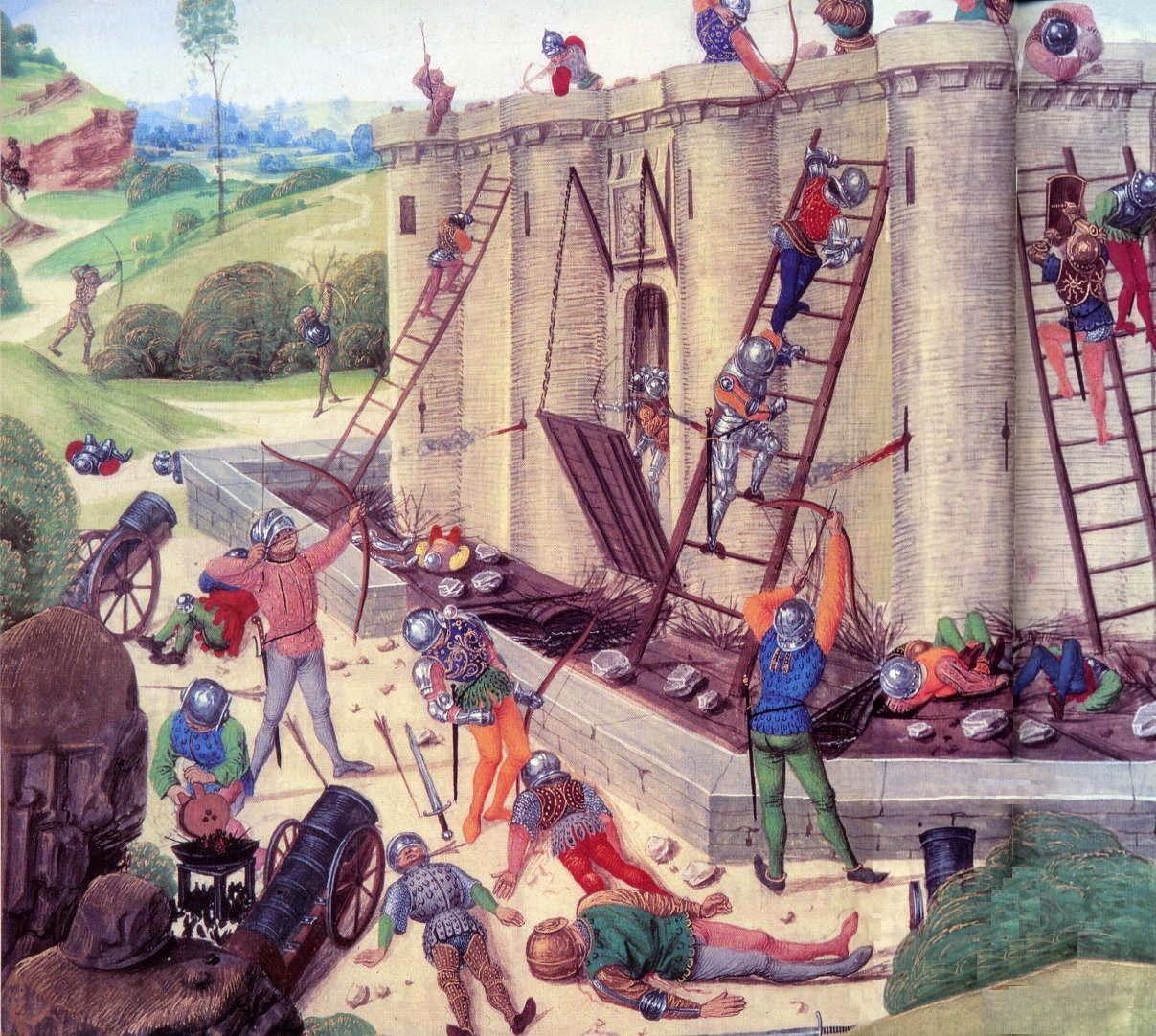 El asalto era, como ya se explicó en su momento, el momento decisivo de un asedio. Cuando todos los intentos de forzar a la rendición por parte de los sitiadores habían fracasado, o cuando el otoño se echaba encima y había que dar término como fuera a aquella situación de espera interminable, o cuando las provisiones de los atacantes estaban bajo mínimos y habían tenido que empezar a matar a las mulas para poder comer, o incluso cuando se intuía o se sabía que los defensores también habían empezado a comerse las suelas de las botas y se podía dar el empujón final para rematar el cerco, el caudillo de la mesnada o la hueste podía decidir que un asalto a fuerza podía vencer la resistencia de la guarnición y apoderarse de la fortaleza de una puñetera vez.