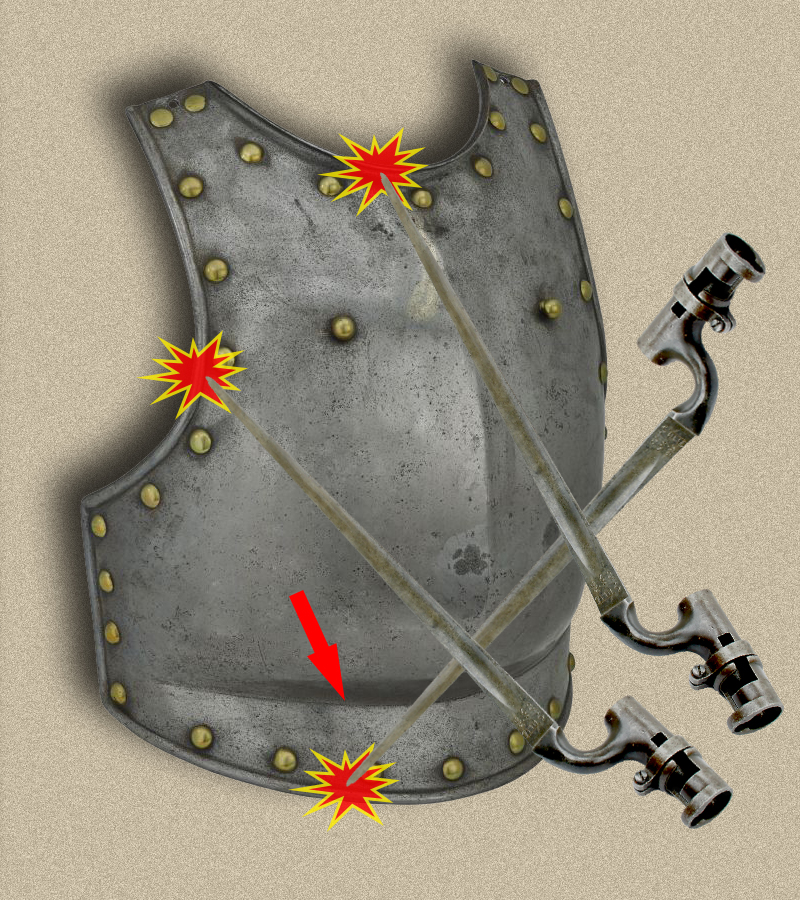 Pero, como decimos, contra las balas eran totalmente inservibles salvo casos contados en que impactase una bala perdida que venía volando desde al menos doscientos metros. Hay datos de unas pruebas que efectuaron en 1807 tomando tres corazas: la reglamentaria de los coraceros, un modelo alemán y un antiguo peto de los que usaba la caballería durante la Guerra de los Siete Años (1756-1763) que pesaba casi lo mismo que la coraza entera del ejército gabacho, 6,5 kg. En dichas pruebas se dispararon balas de mosquete a una distancia inicial de 140 metros, que las dos segundas resistieron mientras que el elegante modelo de los coraceros fue perforado sin problema. Solo el viejo modelo fue capaz de resistir a corta distancia en la última prueba, efectuada a solo 9 toesas (16 metros). Al llevar a cabo las pruebas con pistola, pues más de lo mismo. El modelo francés fue perforado a 33 metros, la distancia inicial, mientras que los otros dos modelos se quedaron tan campantes cuando les dispararon a solo 16 metros. Así pues, los ejemplares que se conservan con abolladuras tan substanciosas como la que presenta el ejemplar de la foto superior fueron el resultado de tener una potra tremenda ya que se trataba de balas perdidas que acertaron en el pecho en vez de en plena jeta, lo que habría acabado con la mísera existencia del usuario de la coraza en cuestión.