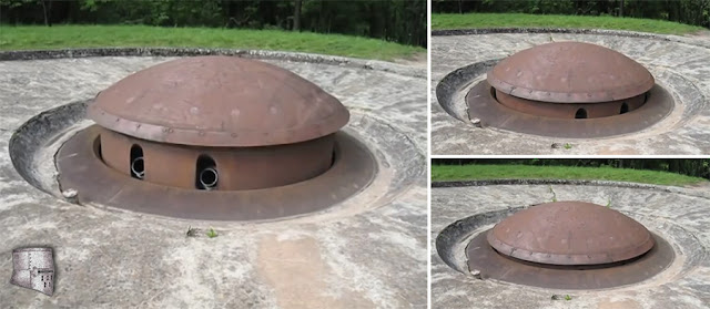 Por otro lado tenemos la cúpula 75-33 (foto de la derecha), armada con una pareja de cañones de 75 mm. acortados para adaptarlos al interior de la cámara de tiro. Esta cúpula tenía la particularidad de que podía efectuar tiro directo sobre el enemigo, para lo cual se le practicó a la pared del cilindro una abertura desde la cual el artillero podía hacer los cálculos mediante observación directa con un visor. Dicha abertura estaba situada entre ambas piezas que, en este caso, sí tenían la opción de poder graduar el ángulo vertical independientemente para efectuar fuego de barrera. Considerando la enorme cadencia de tiro, cualquiera que se intentara acercar corriendo tras explotar un proyectil cerca de él vería como al cabo de un instante lo explotaba otro en sus narices. Como sistema de seguridad, estas cúpulas no podían disparar a menos que estuvieran elevadas y con las recámaras cerradas, y no podían retraerse mientras que no se abrieran dichas recámaras y las vainas servidas hubieran sido eyectadas. Por lo demás, al igual que sus compañeras estaba dividida en tres niveles y la distribución del personal era similar. Solo se diferenciaban en la enorme dotación de munición depositada en el pañol: 6.400 proyectiles divididos de la siguiente forma: 6.080 de alto explosivo y rompedores, 192 perforantes y 128 metralleros. En total se instalaron 21 cúpulas de este modelo, 6 fabricadas por la Châtillon-Commentry et Neuves-Maison, 11 por la Batignolles-Châtillon y 4 por la Chantiers de Loire. El precio de cada una era un pelín bastante exorbitante: 4’5 millones de francos incluyendo las armas y la instalación.